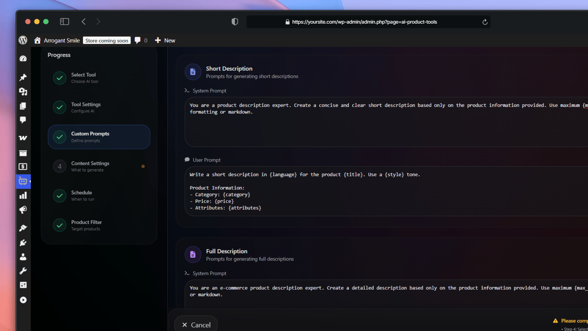 - Smart Context Analysis: The AI analyzes product categories, attributes, prices, and stock status to create factual, relevant content.