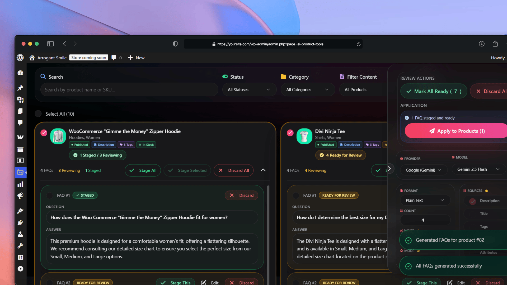 Complete AI Suite for WooCommerce. Automate bulk product content: descriptions, titles, tags & FAQs via OpenAI, Gemini & OpenRouter.