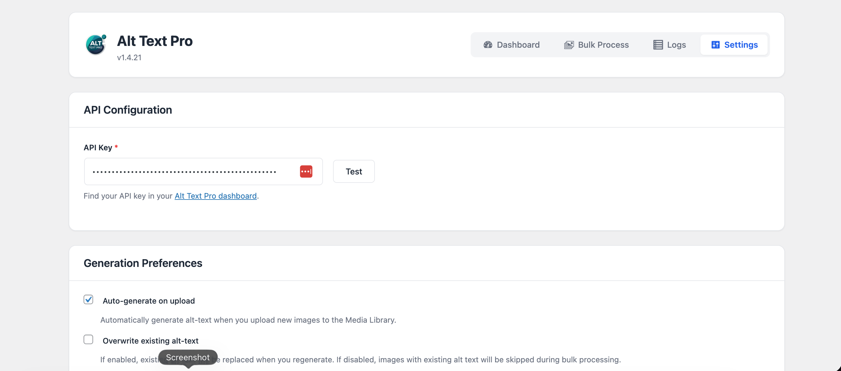- Connect Your Account: Get your API key from Alt Text Pro dashboard