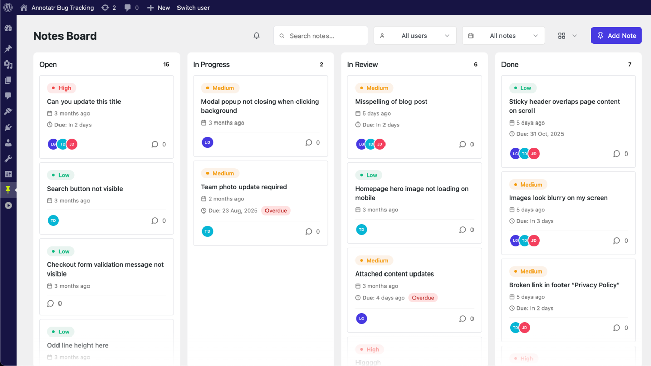 Unlike external tools like Trello, Asana, or Jira, Annotatr lives inside WordPress — capturing on-page feedback with screenshots, metadata, and context automatically. Your team can identify bugs, discuss solutions, and track progress without ever leaving the site you’re building. No context switching, no external accounts, no disconnected workflows.