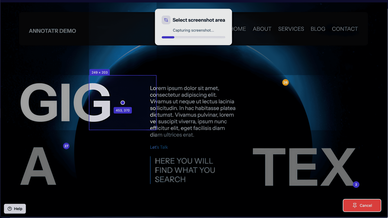 - Point and capture — Select an element, add your feedback, and take a screenshot