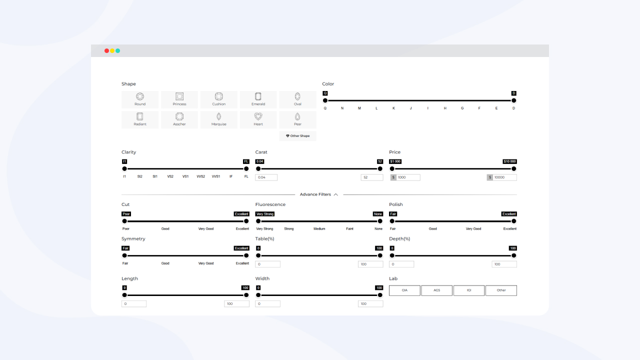 - Advanced search filters for diamonds: shape, carat, color, clarity, and more.