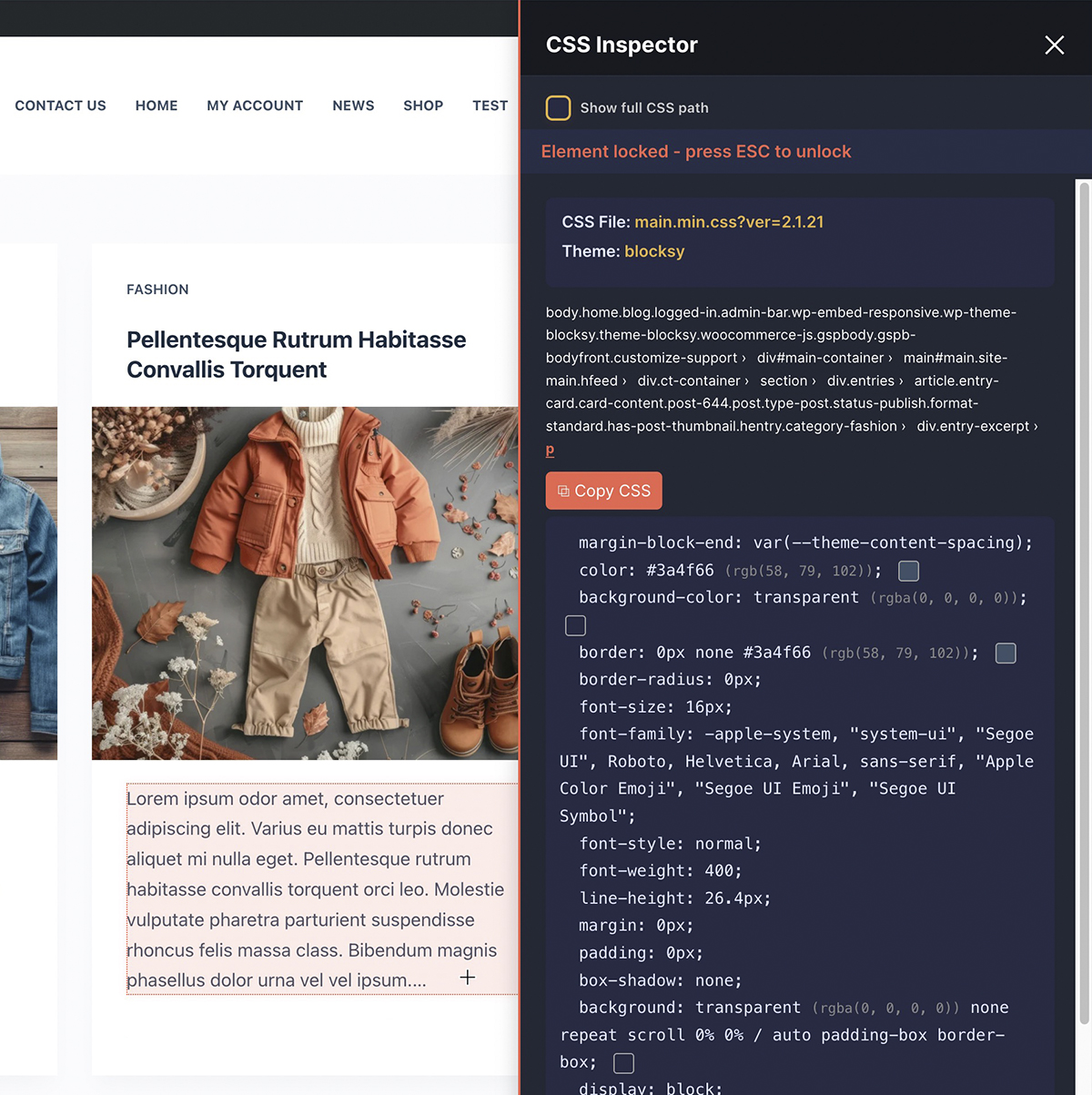 Inspect and copy the CSS of your site’s elements directly from the frontend—fast, simple, and DevTools-inspired.