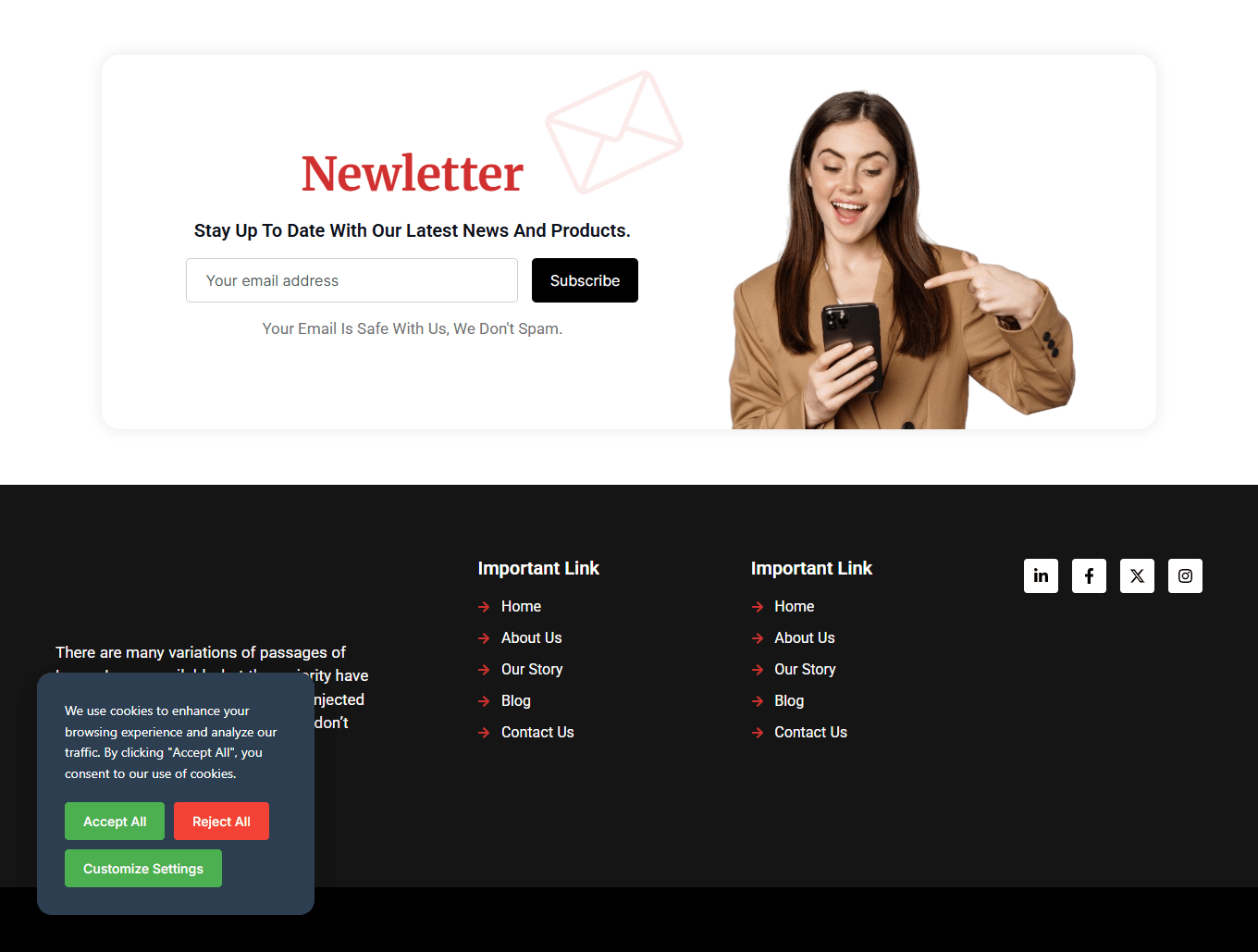 - Customizable Cookie Banner – Fully customizable text, colors, and positioning