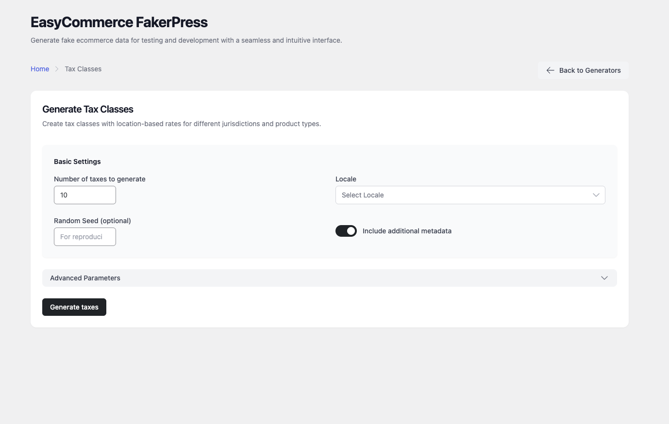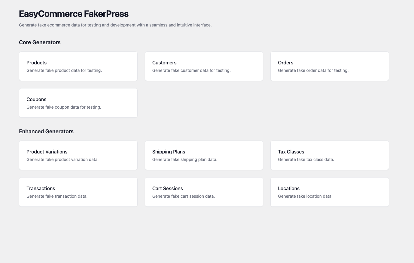 - Core Generators: Introduced 10 specialized tools for products, customers, orders, coupons, variations, shipping, taxes, transactions, carts, and locations.