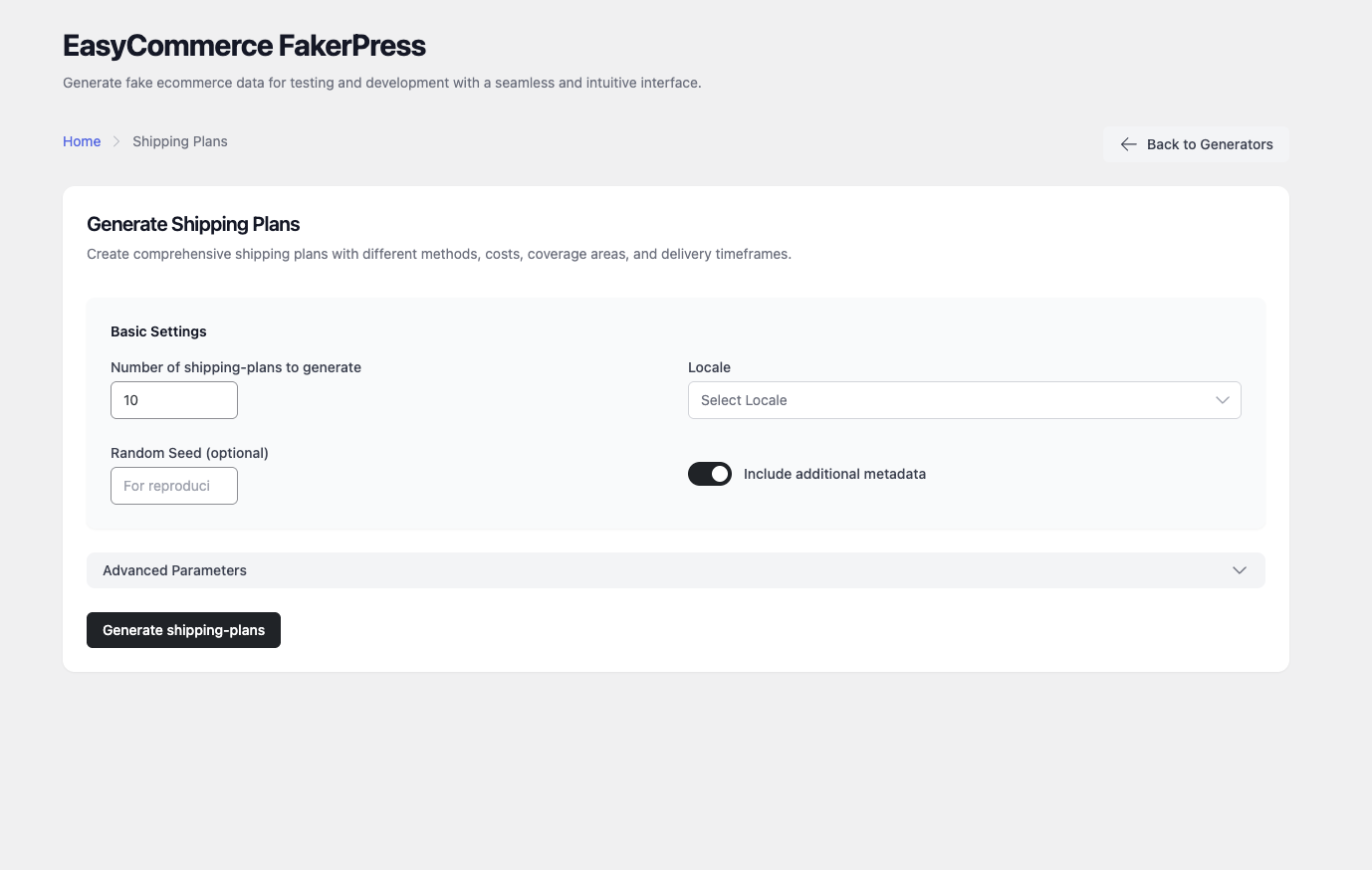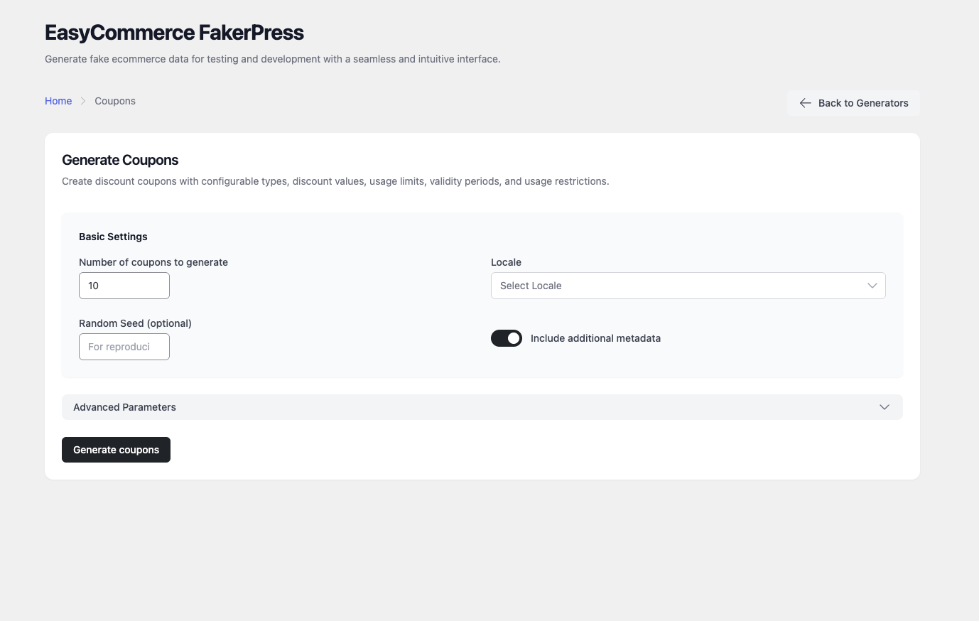 Generate realistic EasyCommerce test data: 10 specialized generators, real-time validation, advanced config, and seamless admin integration.