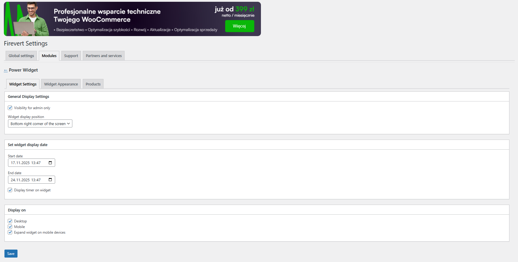 Display rules for PowerWidget, allowing you to either select specific categories and products or show it everywhere with optional exclusions.