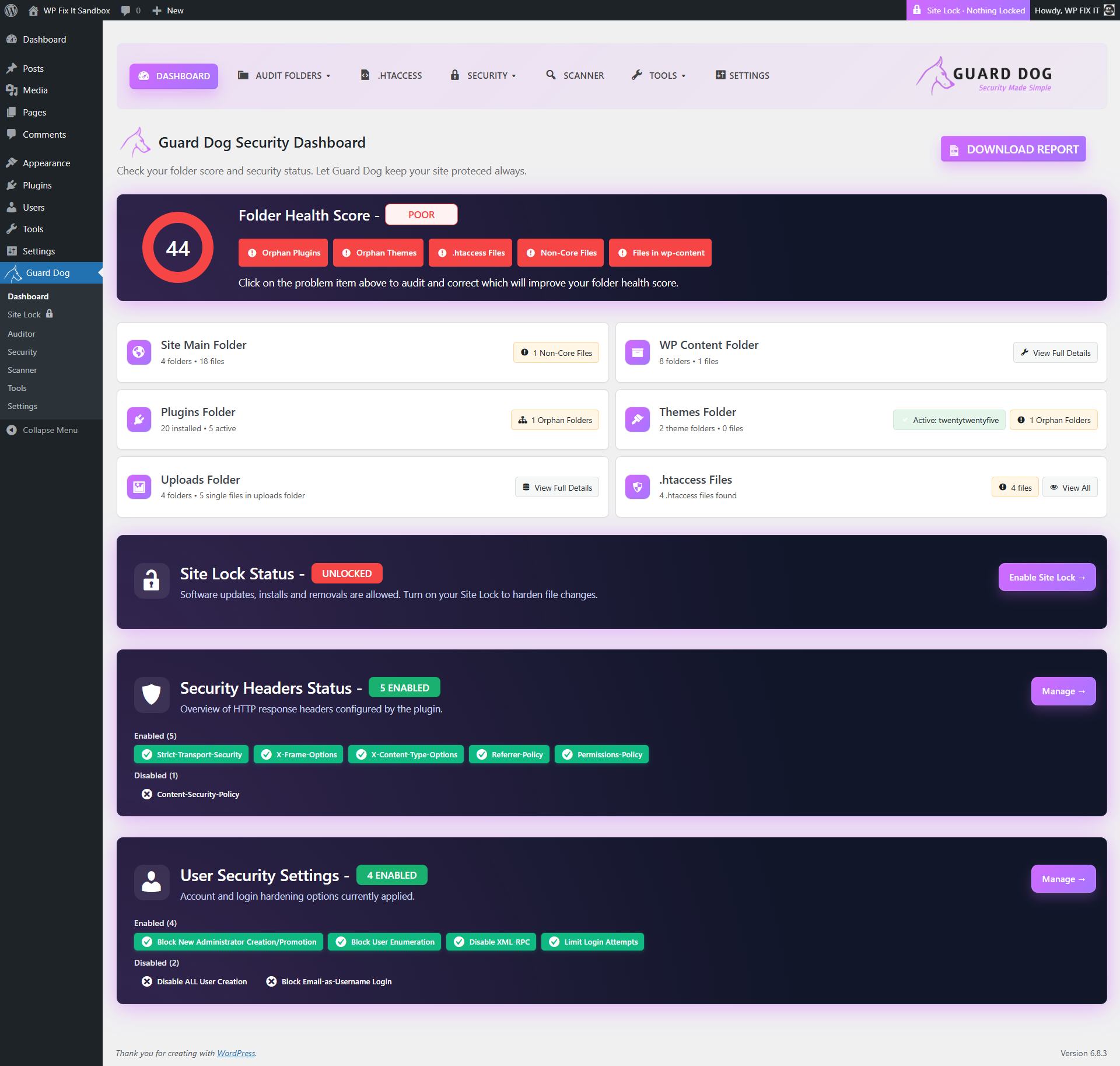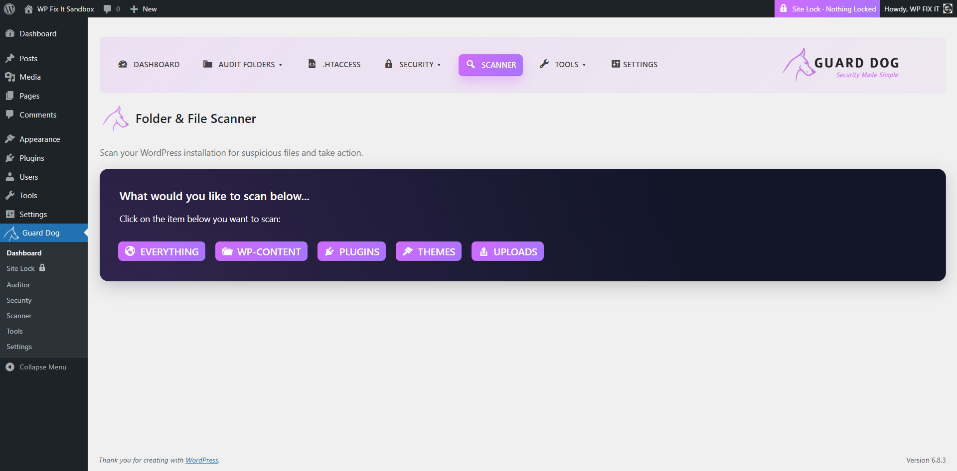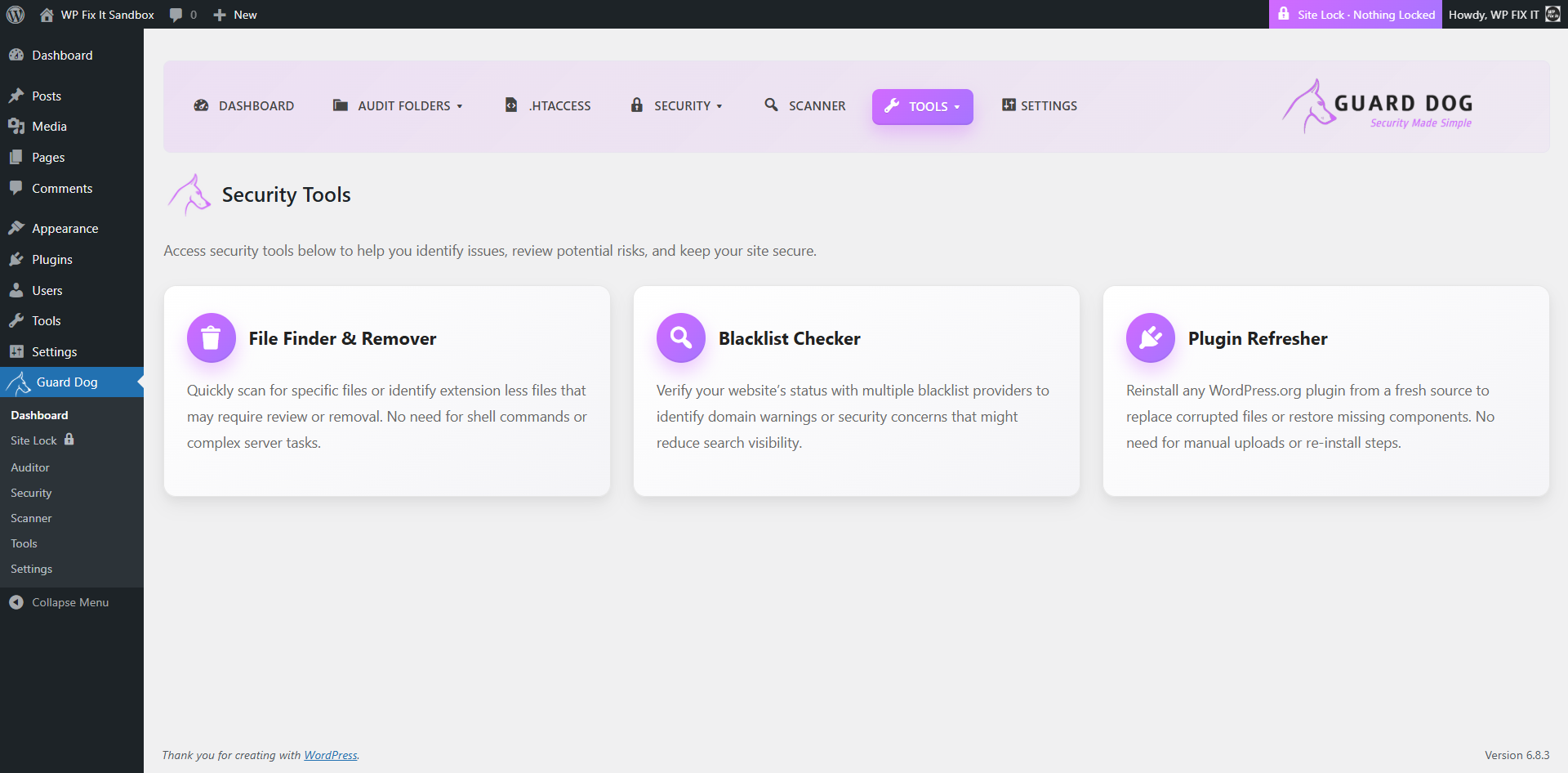 Guard Dog Security & Site Lock helps WordPress administrators keep their installations clean and secure.
