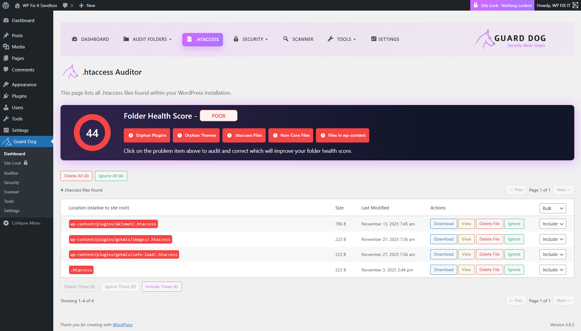 Guard Dog Security takes a disk-first approach. It crawls your entire WordPress installation and inventories every single file and folder, not just plugins and themes. Everything is presented in a clear interface where you can open items to view their contents, mark them to ignore, delete them if they are not needed, or download a copy for backup or investigation.
