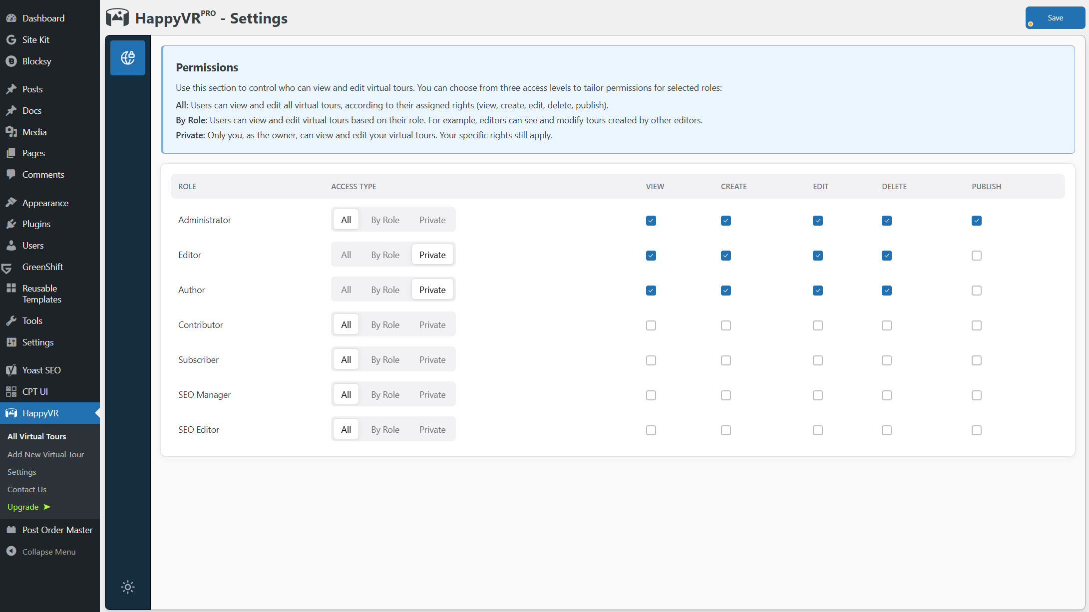 Everything is under the control of the administrator. HappyVR offers fine-grained permission settings, so you can customize the virtual tour security policy for each user or role. For example, you can allow some users or roles to create, view, and edit virtual tours, while restricting others to view-only access.