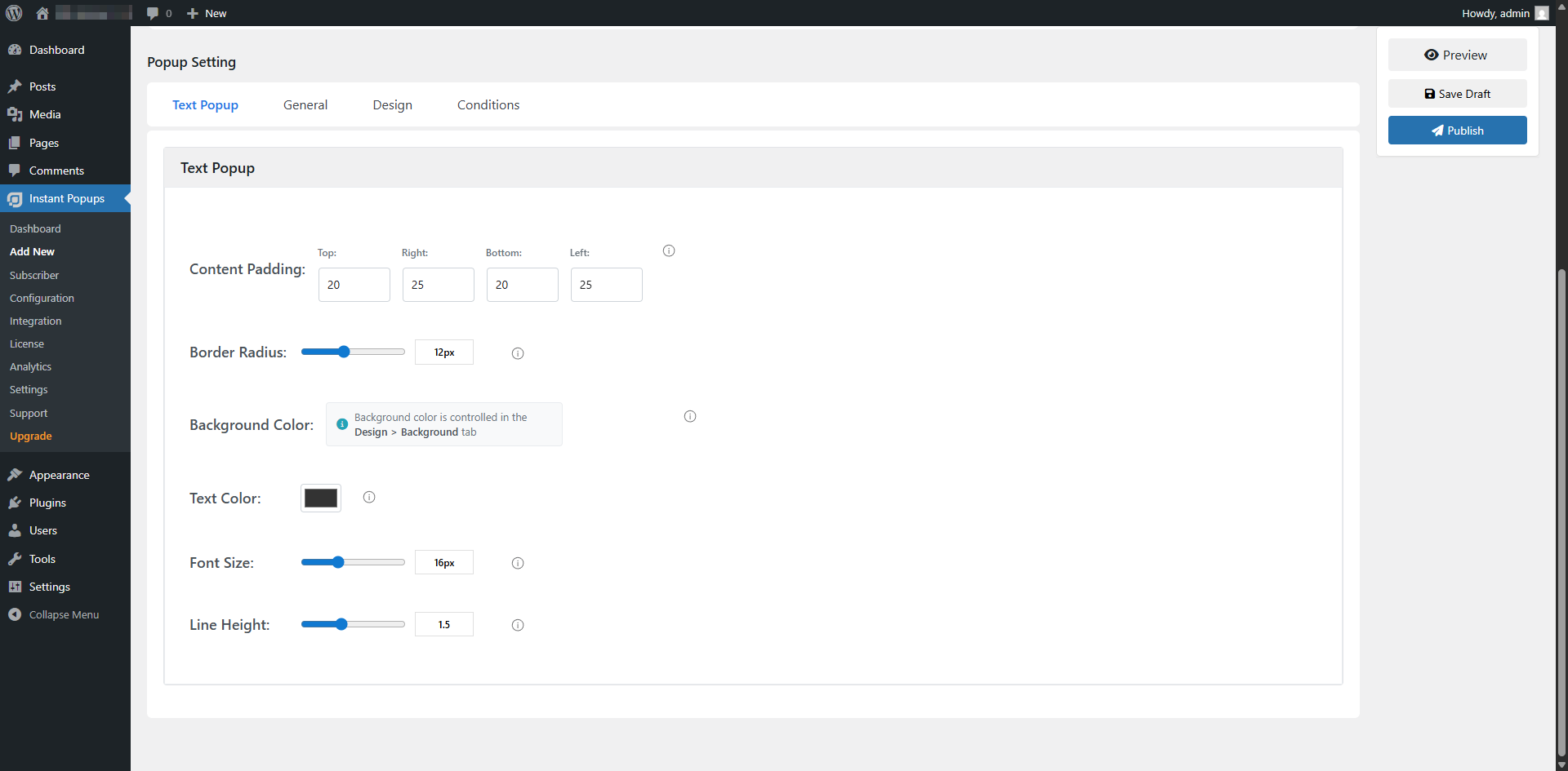 Design settings page for your popup