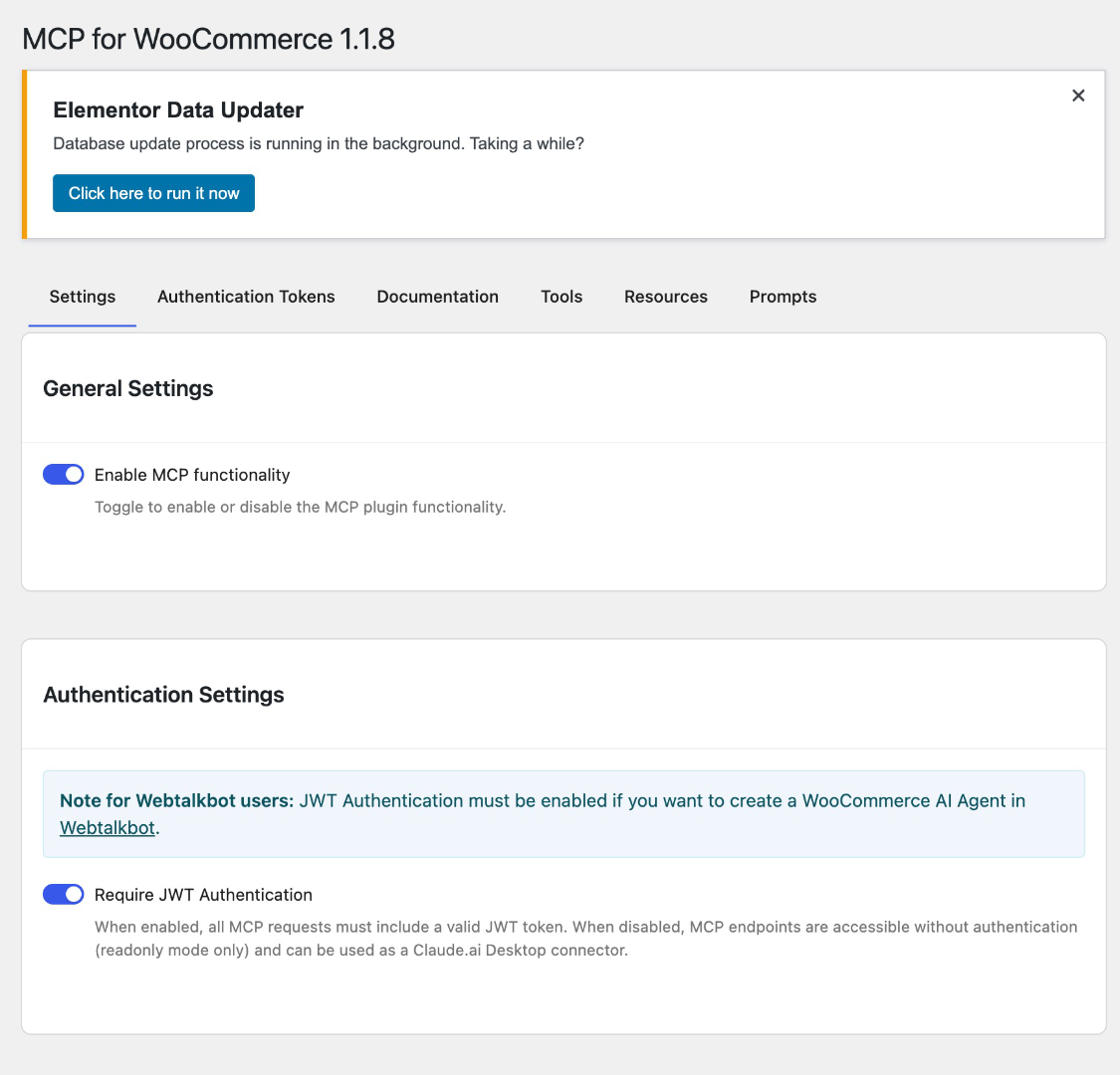 - Navigate to Settings MCP for WooCommerce to configure the plugin.