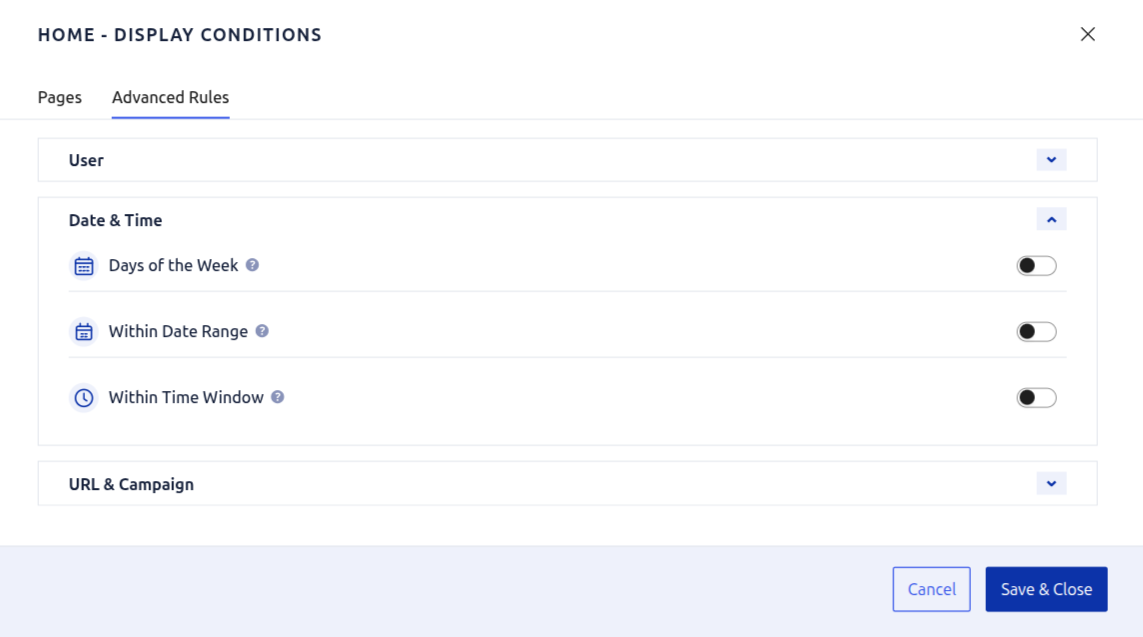 - Entire Site – Create a catch-all rule that always fires. Place it below granular rules when you need fallback behavior.