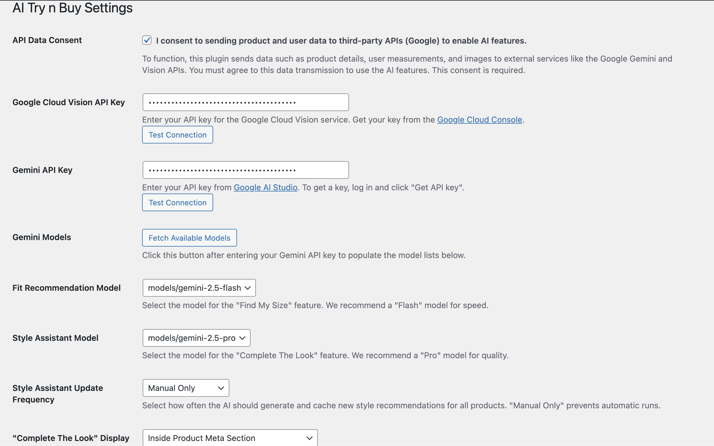 Enter your API keys for Google Cloud Vision and Google Gemini. - Product Settings: Edit a WooCommerce product and find the “AI Try n Buy Settings” meta box.