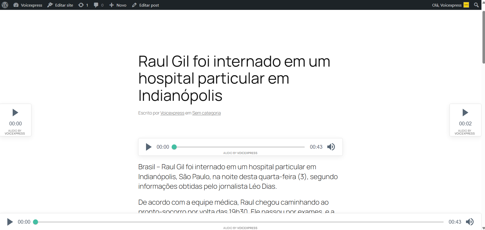 Alguns dados (titulo, url, imagem, nome da categoria e conteudo) do post serão enviados para a API do Voicexpress em https://voicexpress.app, para que seja feito o processamento e criação do áudio.