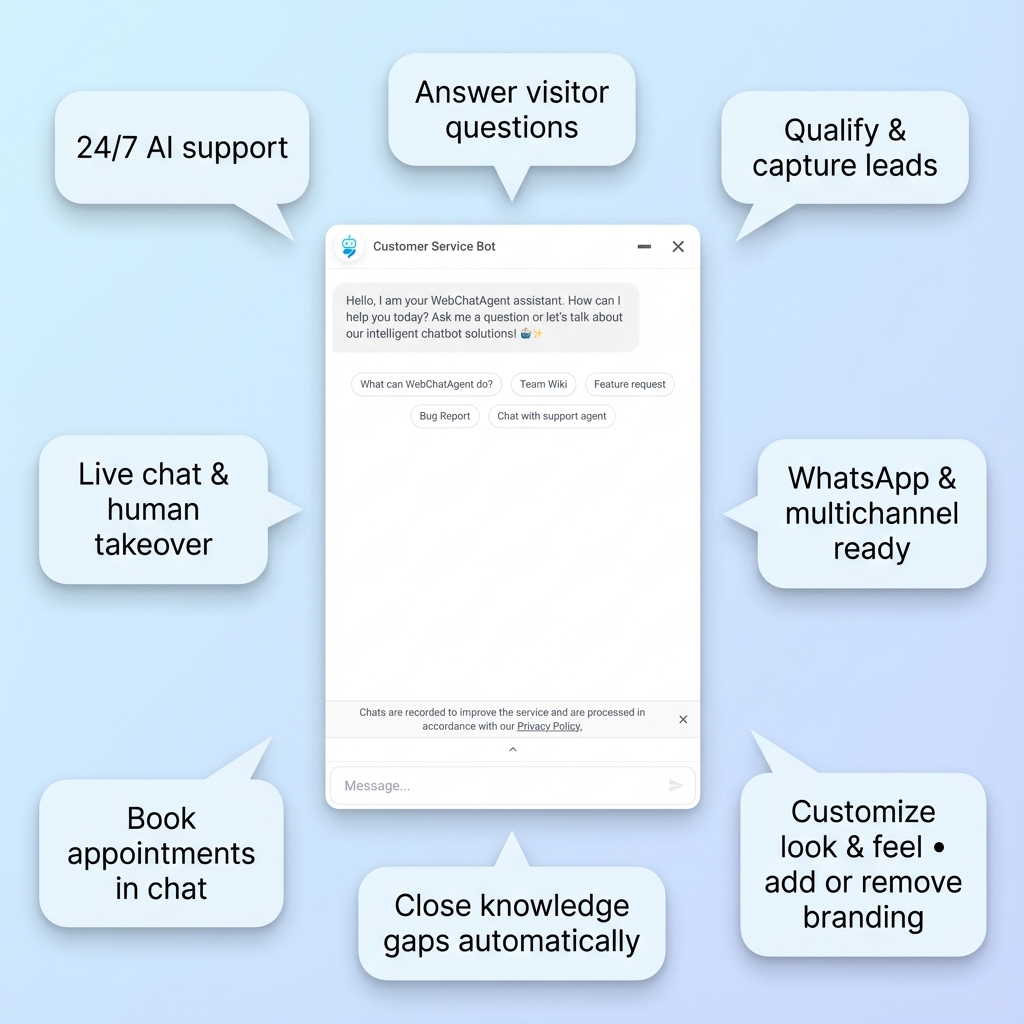 - Generous Free Plan – Start free on WebChatAgent.com and upgrade only when you need more usage or advanced features