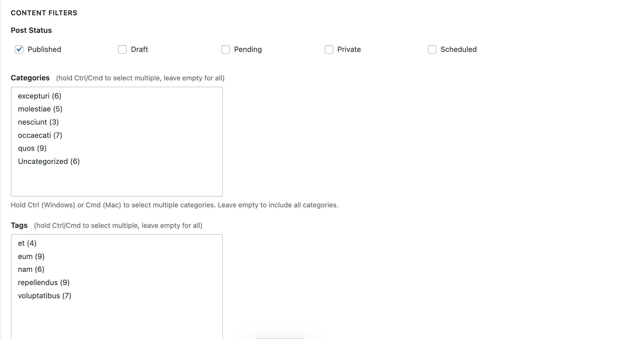 - Post Status: Filter by Published, Draft, Pending, Scheduled, Private, or Trashed