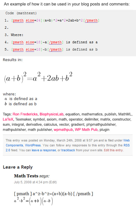 ![WordPress comments with [pmath] tags mixed with plain text (as shown from WP v:2.5.1 admin tool's detail view)](https://ps.w.org/wpmathpub/trunk/screenshot-2.jpg?rev=3401577)