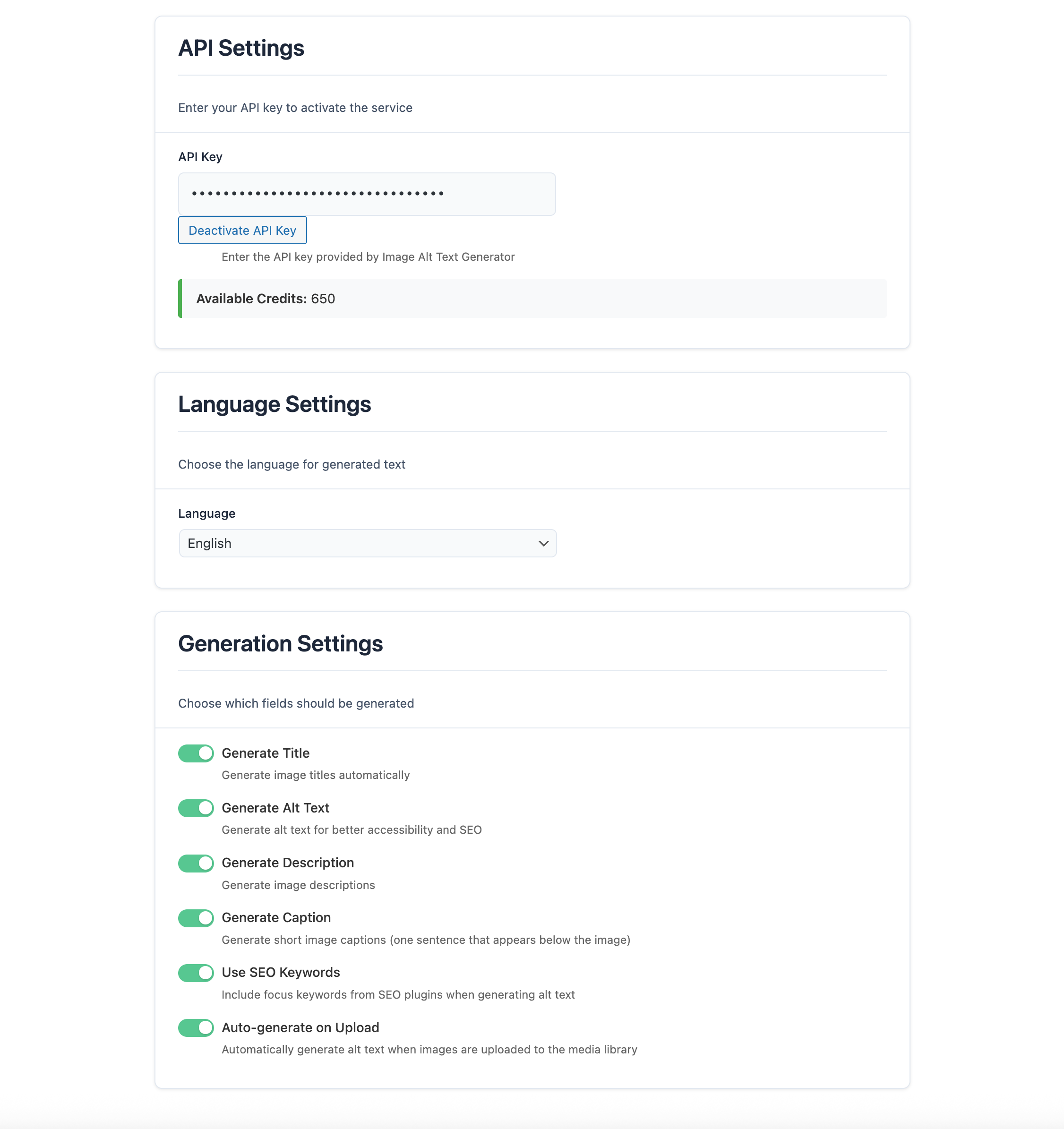 This plugin requires an API key to function. You can get a free API key with limited credits at alt-text-generator.com. Premium plans with more credits are also available.